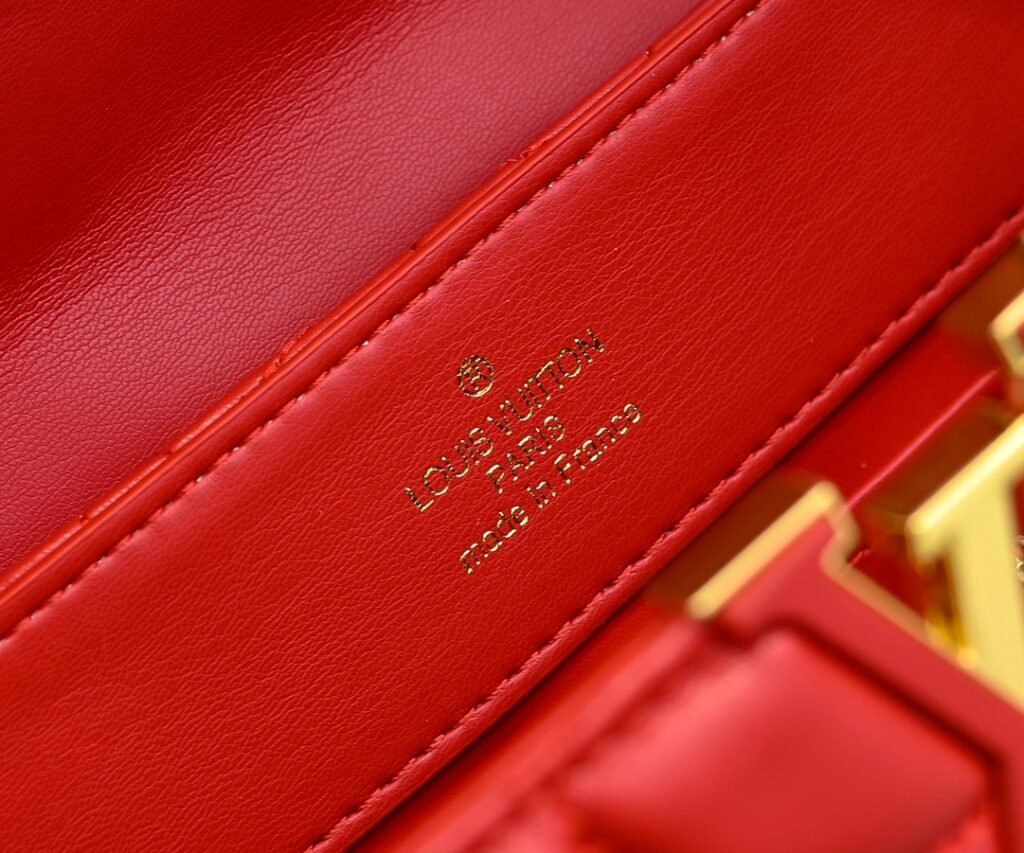 M23999 red. This Monogram embroidered floral design emerges in the elegant quilting, adding to the Louis Vuitton store’s decoration style for the Capucines BB handbag. 33 x 19 x 9 cm