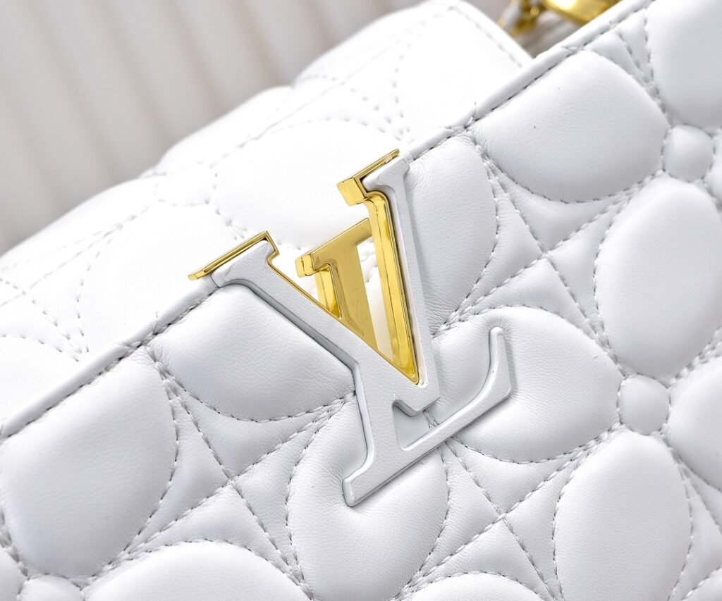 M23999 white. This Monogram embroidered floral design emerges in the elegant quilting, adding to the Louis Vuitton store’s decoration style for the Capucines BB handbag. 33 x 19 x 9 cm