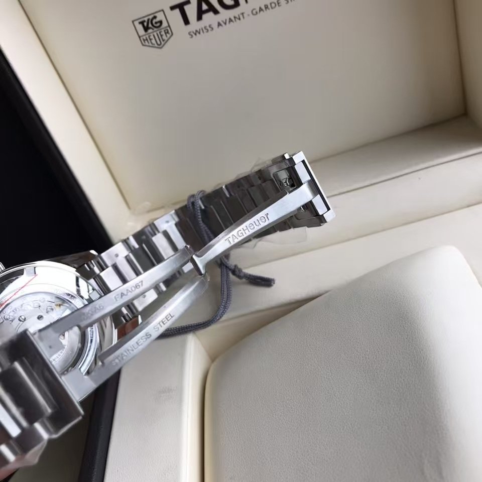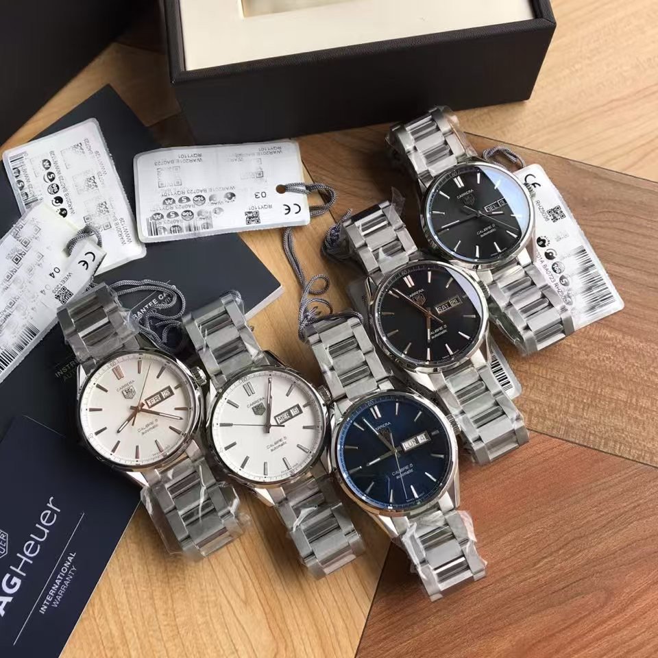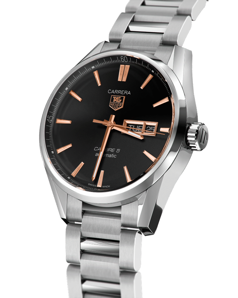 TAG Heuer Carrera Automatic, 41 mm, Steel WAR201C.BA0723 The 41mm day-date model displays the refined the TAG Heuer Carrera styling to perfection. The contrast of black dial and rose gold-plated hands, indexes, logo and Day-Date window is impactful and alluring.
