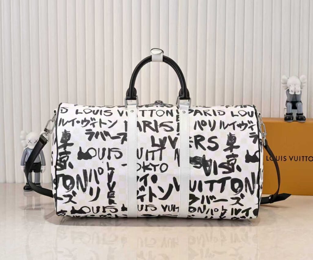 The Keepall Bandoulière 50 travel bag was jointly designed by Japanese designer Nigo and Pharrell Williams. It measures 29 x 23 x 50 centimeters (height x width x length).